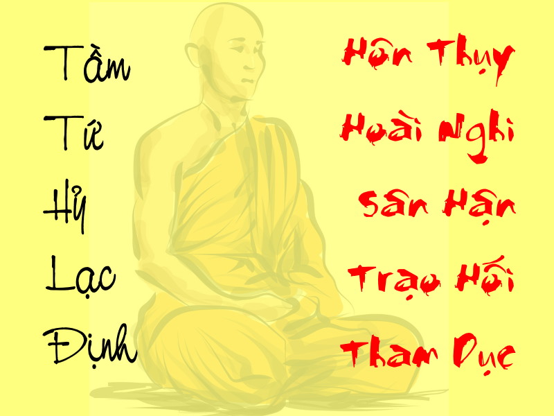 Năm Chi ThiềnTầm đối trị Hôn Thụy Tứ đối trị Hoài Nghi Hỷ đối trị Sân Hận Lạc đối trị Trạo Hối Định đối trị Tham Dục ![]() Tâm bị tham dục giống như nước bị pha màu.