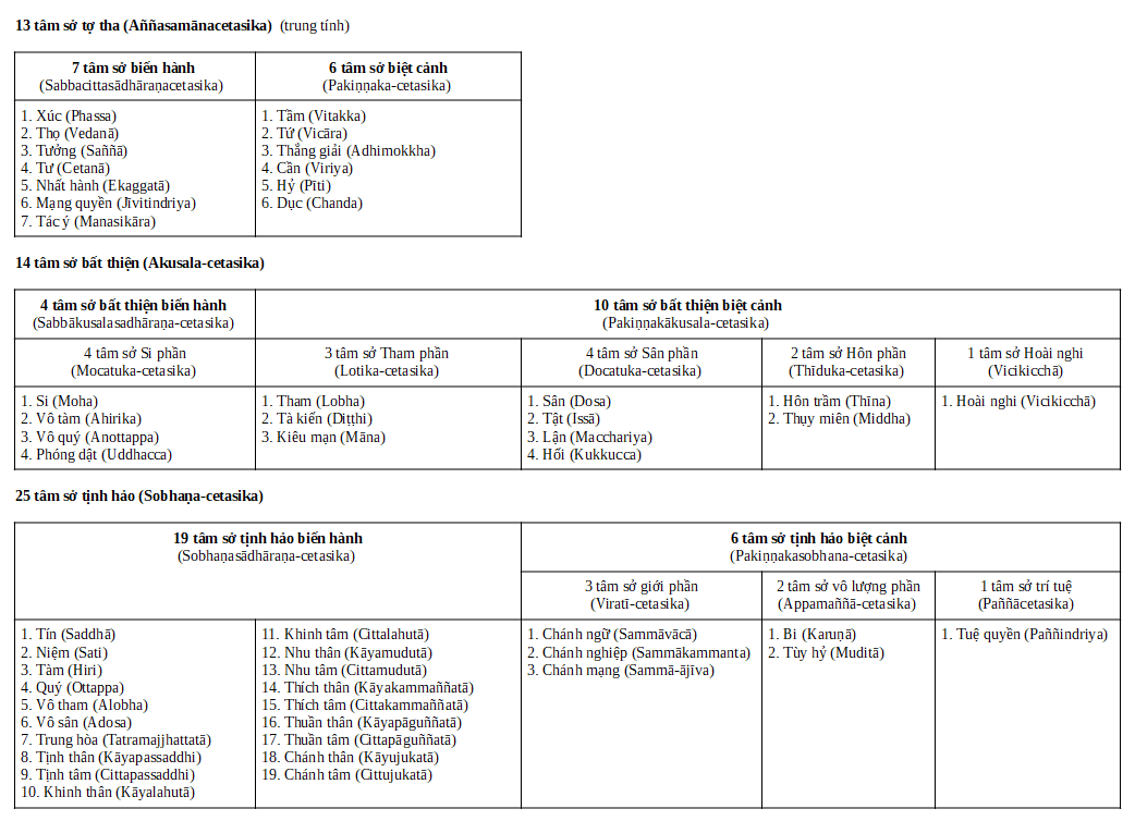 52 Tâm SởTâm lý chúng sanh của con người gồm tâm thiện và tâm ác (tâm bất thiện). Tâm bất thiện: 1 cái biết + 13 tâm sở tợ tha trung tính + 14 tâm sở bất thiện Tâm thiện: 1 cái biết + 13 tâm sở tợ tha trung tính + 25 tâm sở thiện Bất cứ tâm nào cũng dựa vào căn nào đó trong 6 căn (mắt, tai, mũi, lưỡi, thân, ý) cùng với cảnh nào trong 6 cảnh (sắc, thanh, khí, vị, xúc, pháp). Và cộng thêm thứ ba là tâm sở nào đi cùng với nó. Tâm sở giống như nguyên liệu của tâm – trong một viên thuốc cái thành phần tạo ra viên thuốc ấy là nguyên liệu. Từng cái thành phần tạo thành cái tâm đó gọi là tâm sở. 13 tâm sở trung tính là tâm không thiện, không ác. Giống như những chất phụ gia phải có để nấu một nồi canh. Dầu nấu canh khoai hay canh rau thì đều phải có những chất cơ bản đó là nước, muối và bột nêm. Tất cả phiền não đày đọa chúng sinh như: tham, sân, si, ái, mạn, kiến, nghi, hôn trầm, nghi hoặc, ghen tuông, ích kỷ, nhỏ mọn ... tất cả đều đi ra từ con số 14. Tất cả những pháp tu mà xưa giờ vẫn thờ, lạy, xem nó là ghê gớm như thất giác chi, bát chánh đạo, tứ niệm xứ, ... đều đi ra từ con số 25. Như vậy tu hành là anh rút củi bên đây đút qua lò bên kia. Phật với mình cùng giống nhau ở chỗ 1 cái biết + 13 tâm lợi tha. Nhưng Phật thì cộng thêm với 25 cái tịnh hảo, còn chúng ta thì cộng thêm 14 cái bất thiện.